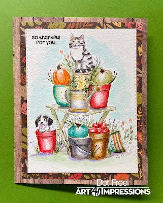 I used the 5434 Wood Table Foundation from Art Impressions and a Misti to stamp it using Memento London Fog Ink. Then use a stamp positioner to add the cat from the 2021 Limited Freebie set inked in Tombow N25. Did you know you can request the freebie of your choice from a variety when you place an order of $30 or more with Ai? You can use any animals you want to make this card. Personalize it to who you plan on giving your card to like I did or use your own animals for reference. Use the positioner to stamp the dog from the 4959 Dogs Set inked in N25. You will then use the positioner to stamp the pumpkins and apples from the 5059 Harvest Set in the pots. The roses are from the 5258 Flower Set 4 inked in 177 and 925. The foliage around the roses and in the other pots is from 5126 Foliage Set 4 inked in 177 and 565. Use a Copic fine tip black pen to darken the cat's eyes and stripes and the dog's eyes and nose. The sky is 379. The sentiment is from the 5039 Grateful Hearts Set inked in Versafine onyx black ink. The die used was the 5063 Double Stitched Rectangle A2 die.